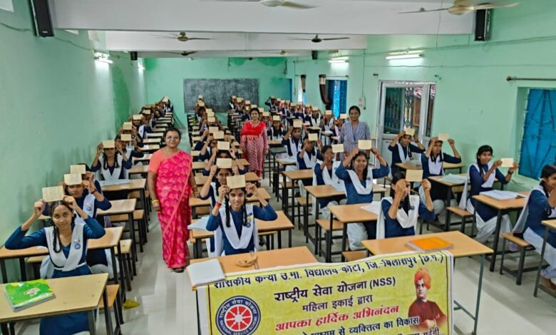 *करगीरोड, कोटा :* शासकीय कन्या उच्चतर माध्यमिक विद्यालय कोटा में संस्था की प्राचार्य श्रीमती आशा दत्ता के नेतृत्व एव मार्गदर्शन तथा मतदाता जागरूकता कार्यक्रम प्रभारी व्याख्याता डॉ. रामबाबू गुप्ता के संचालन में निर्वाचन आयोग द्वारा निर्धारित समय बद्ध कार्यक्रम अनुसार आगामी विधानसभा निर्वाचन में शत प्रति शत मतदान हेतु मतदाता जागरूकता कार्यक्रम ‘स्वीप’ के तहत संस्था की 500 से अधिक छात्राओं ने अपने माता-पिता को एवं सभी वयस्क मताधिकार प्राप्त अपने परिवार को पोस्टकार्ड लेखन अभियान चला कर शत प्रतिशत मतदान हेतु आह्वान करते हुए पत्र लिखा साथ ही “शत-शत मतदान बिलासपुर जिले का अभिमान” के संदेशों के साथ एक विशाल मानव श्रृंखला “वोट” का निर्माण कर मतदाता जागरूकता हेतु अपना संदेश दिया ।