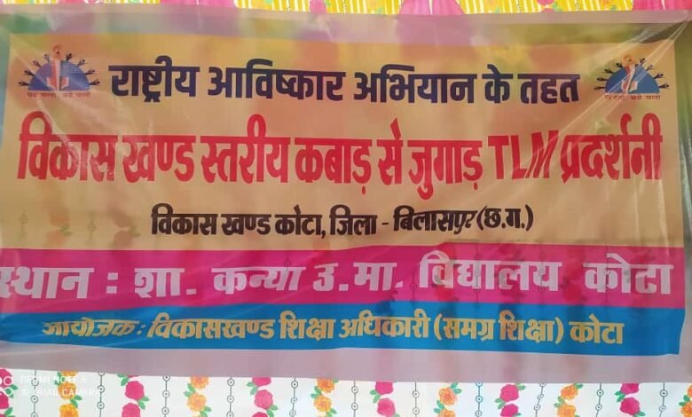 प्रेमेंद्र करगी रोड- कोटा विकासखण्ड शिक्षा अधिकारी श्री विजय टांडे जी के मार्गदर्शन में बच्चों के पढ़ाई को सुगम बनाने के लिए विकासखण्ड स्तरीय कबाड़ से जुगाड़ TLM प्रदर्शनी व क्वीज प्रतियोगिता का सफल आयोजन शासकीय कन्या उच्चतर माध्यमिक विद्यालय कोटा में किया गया,जिसमें शासकीय कन्या उच्चतर माध्यमिक विद्यालय के प्राचार्य श्रीमती आशा दत्ता,सहायक विकासखंड शिक्षा अधिकारी श्री नवनीत तंबोली,श्रीमती संध्या जायसवाल,श्रीमती किंडो रोज विकासखंड स्त्रोत समन्यवक श्री प्रमोद शुक्ला BRC कार्यालय से श्री नरेश सूर्यवंशी,श्री सुदीप जांगड़े, भूपेंद्र चंद्राकर,कु.रेशमी जगत प्रमुख रूप से पूरे कार्यक्रम समय तक उपस्थित रहे सभी के द्वारा कबाड़ से जुगाड़ के माध्यम से TLM बनाना एवं बच्चों को उनसे मिलने वाले लाभ के बारे में बताया प्रतियोगिता में चार सदस्यीय निर्णायक मंडल जिसमें ABEO श्री नवनीत तंबोली,ABEO श्रीमती संध्या जायसवाल,ABEO श्रीमती किंडो रोज व निर्णायक सहायक के रूप में संकुल समन्यवक रहे,इनके द्वारा विकासखंड के 51 संकुल से चयनित होकर आए हुए TLM का निरीक्षण कर, प्रथम, द्वितीय तृतीय ,विजेताओं का चयन किया गया, साथ ही क्विज प्रतियोगिता में माध्यमिक शालाओं के बच्चों का सामान्य ज्ञान परीक्षा आयोजित कर प्रथम द्वितीय तृतीय का चयन किया गया,प्राथमिक शालाओं में प्रथम शासकीय प्राथमिक शाला खरगहनी ,द्वितीय प्राथमिक शाला टीकरी पारा, तृतीय प्राथमिक शाला बालक बेलगहना,माध्यमिक शालाओं में प्रथम शासकीय पूर्व माध्यमिक शाला मोहदा द्वितीय माध्यमिक शाला रानीबछाली,तृतीय माध्यमिक शाला मटसगरा,इसी प्रकार क्विज प्रतियोगिता में प्रथम माध्यमिक शाला रिगवार,द्वितीय माद्यमिक शाला पीपरतराई,तृतीय माध्यमिक शाला खुरदुर नें प्राप्त किया इन सभी विजेताओं को मोमेंटो,मेडल,प्रशस्ति प्रमाण पत्र देकर सम्मानित किया गया,कार्यक्रम का सफल संचालन श्री भूपेश पाण्डेय व राजकुमार कोरी ने किया,कार्यक्रम को सफल बनाने में सभी अधिकारीगण,संकुल समन्यवक गण व सभी शिक्षकों का विशेष सहयोग रहा।।